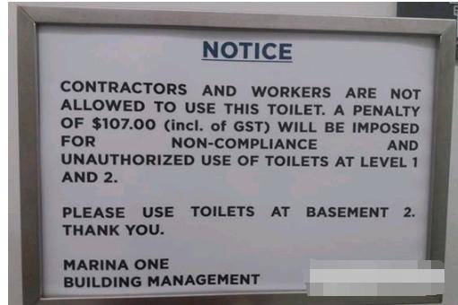 据说,这是滨海盛景商场的一张告示张贴,当中写着管理层禁止建筑承包商及工人使用一楼及二楼的厕所,若违规使用,将面对包括消费税在内的107元罚款。当中也提到,建筑工人如果想要用厕所,只能用二层的厕所。