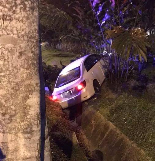 有网友在Facebook上发布了现场照片,照片显示,一辆白色轿车撞进了路边沟渠中。