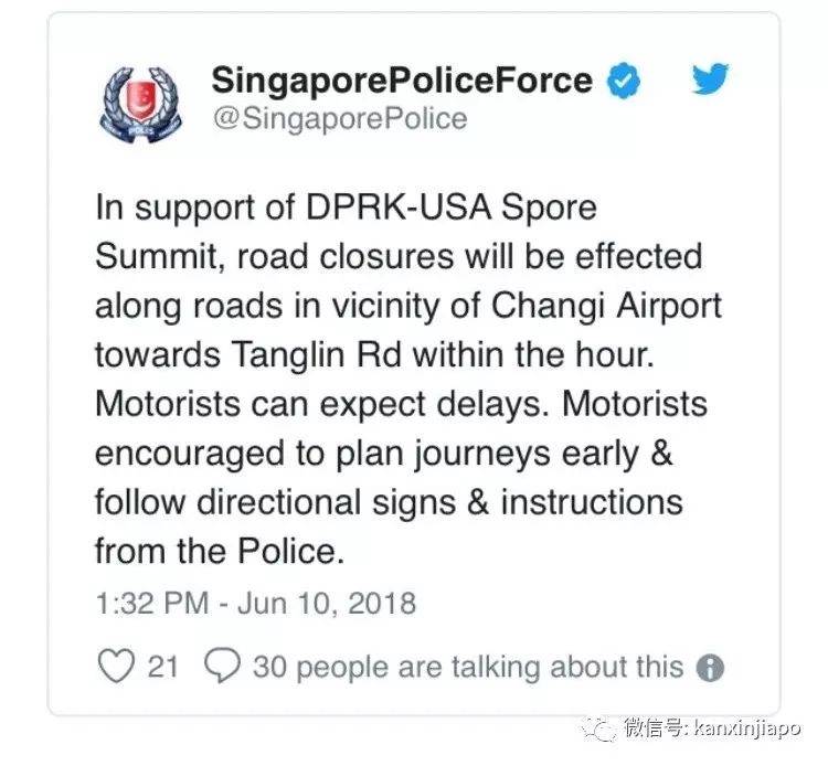 今天为了迎接金正恩的到来,先是新加坡警察部队下午一点半特别发布文告,为配合特金会,樟宜机场一带往东陵路(Tanglin Road)的路段暂时关闭。