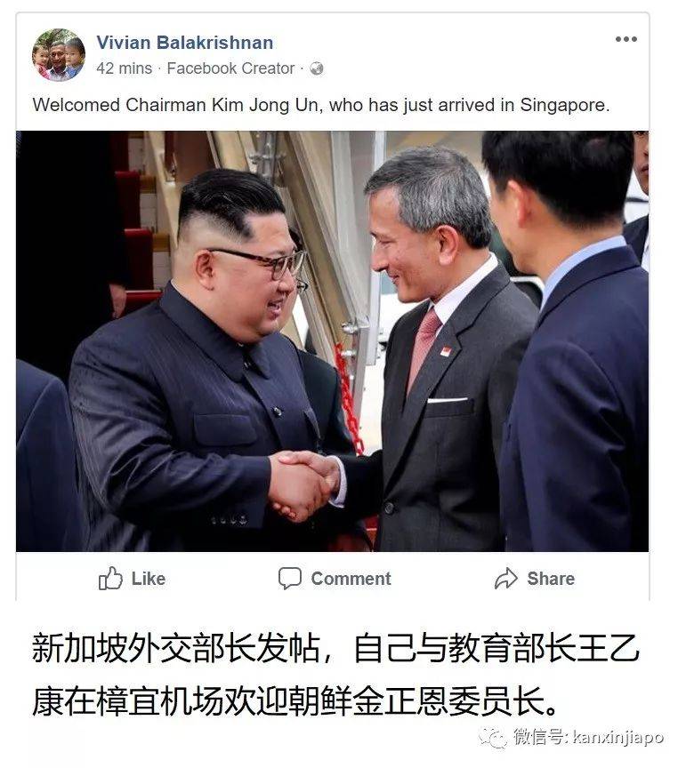 金正恩乘坐的专机于下午2点37分抵达新加坡,外交部长维文医生与刚下飞机的金正恩握手~