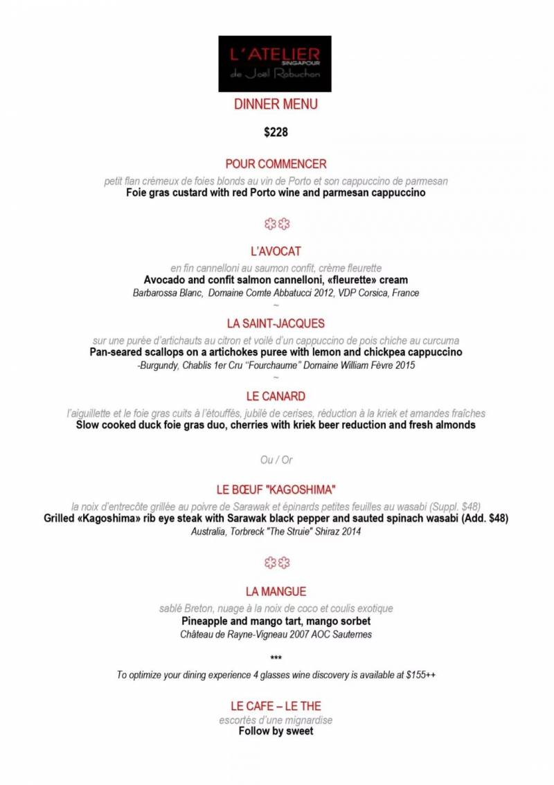米其林二星餐厅L’Atelier de Joël Robuchon的晚餐价格为S$228起。以上菜单都只是包含菜色,如果要餐酒搭配,酒的价格另算。
