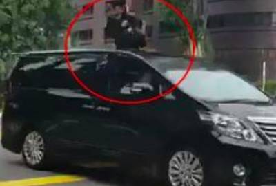金正恩的车队昨天下午靠近新加坡瑞吉酒店时,其中一辆休旅车车顶窗口屏,就冒出两名穿着黑色西装的电视摄像师,拍摄围观的人群。