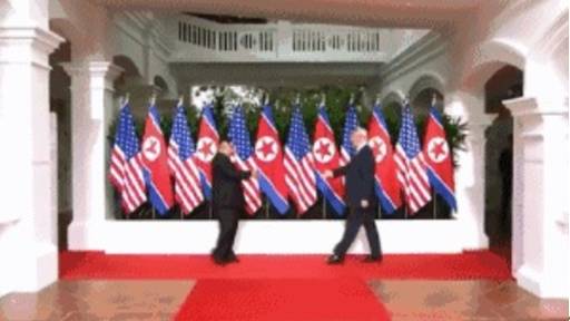 特朗普与金正恩的握手大约持续了十几秒,期间双方交换了几句话,似乎在互致问候。特朗普没有上演以往和诸多其他国家领导人会见时的“特式拽人握手大法”,只是用左手轻轻地拍了拍金正恩的手臂。