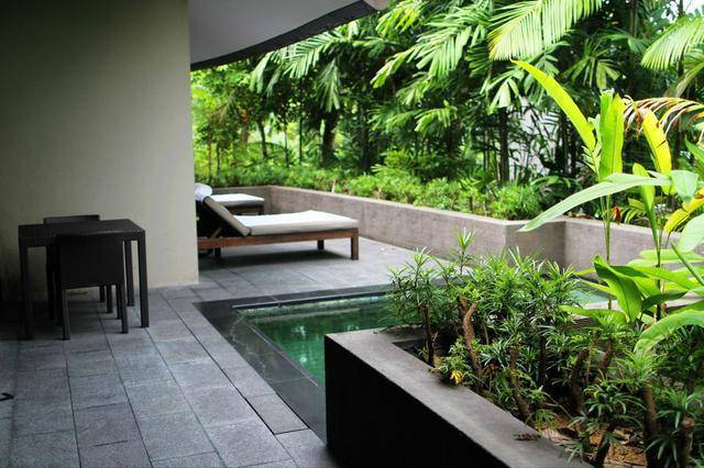 三座户外游泳池分布于庭院之中,让人在绿意盎然的环境里放松身心。