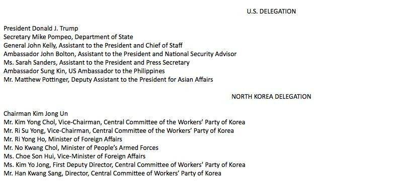 美国代表包括国务卿蓬佩奥、国家安全顾问博尔顿、白宫幕僚长凯利、白宫新闻发言人桑德斯、美国驻菲律宾大使金成、总统亚洲事务副助理波廷格6人。
