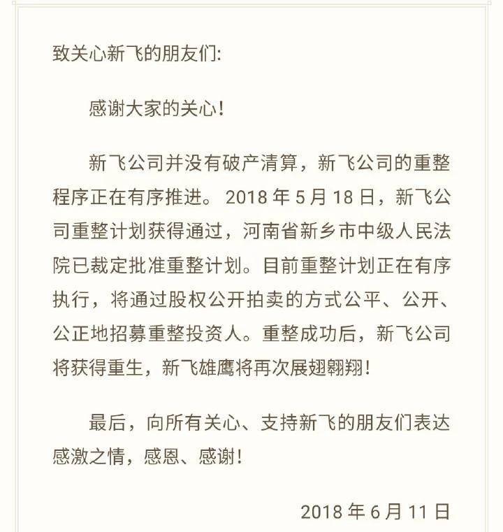 “重整成功后,新飞公司将获得重生,新飞雄鹰将再次展翅翱翔!”