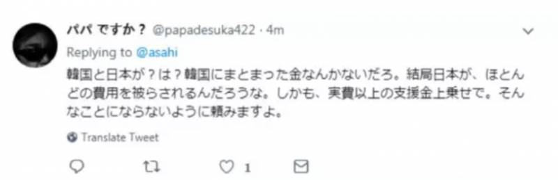 这位网友不客气地指出:要韩国和日本付钱?韩国哪儿有钱啊,到最后还不是日本掏腰包,搞不好还要追加更多的支援金。拜托了,事态可千万不要朝这个方向发展啊!