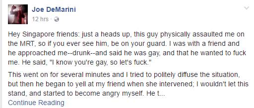 去年4月份,一则新加坡71岁大叔在地铁上向一名美国男子强行求欢的视频在网络上疯传。