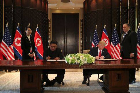昨天下午1点42分左右,美国总统特朗普和朝鲜领导人金正恩出席了签署仪式,以确认峰会的进展。