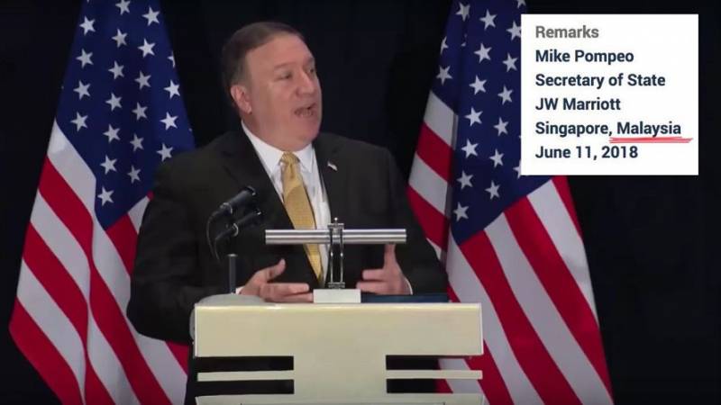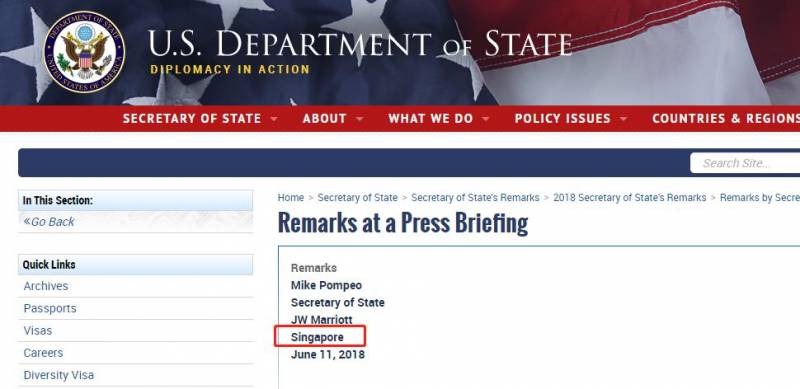 美国国务卿麦克·蓬佩奥(Mike Pompeo) 在星期一(6月11日) 发表的简报转录里,将记者会地点写成“JW Marriott,Singapore,Malaysia” (万豪酒店,新加坡,马来西亚),嗯 ………