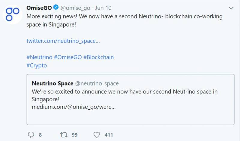 2018年6月10日,OmiseGo官方twitter发布消息,继日本东京之后,Neutrino将区块链联合办公业务拓展至新加坡。此次选址位于The Great Room Centennial Tower中心,项目提供独立办公室、hot desks、会议室及可容纳150人活动场地的共享办公空间。