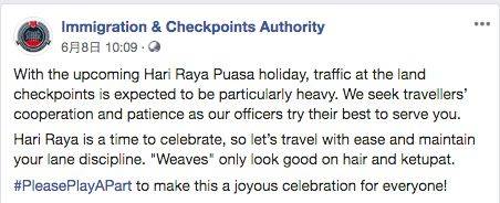 广告因此,这个开斋节长周末,兀兰与大士关卡的交通流量将会很高。尤其是6月14日至18日,前往马来西亚的民众将会面临塞车的情况。