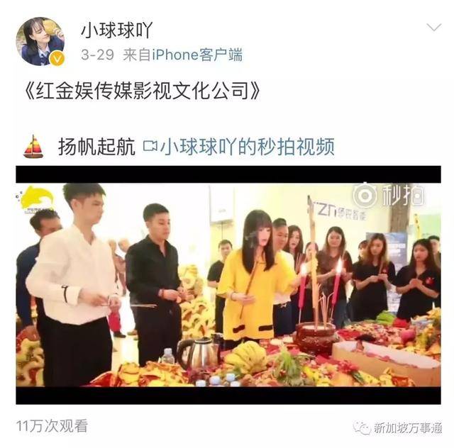 3月29日,球球在微博发布一个55秒的小视频,并配文《红金娱传媒影视文化公司》扬帆起航。