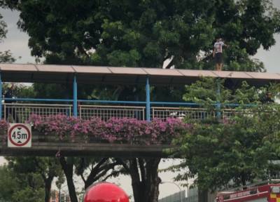 新加坡一名女子在6月14日傍晚5点左右,不知何故爬上义顺2道的一个天桥顶,引起骚动。当局到场设立两个充气垫,并在约一个小时后将女子救下送院。