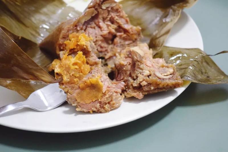 肉粽里的咸蛋非常的大颗,旁边是肥瘦相间的猪肉,还有栗子和香菇,整体算是非常饱满。