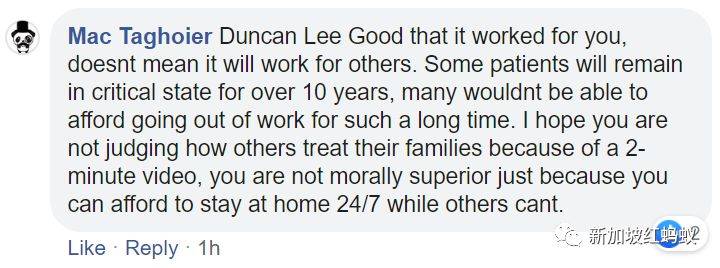 “Duncan Lee很高兴看到你这么做行得通,然而并不代表这个方法对他人而言行得通。有些病人会一只停留在严重的阶段超过10年,有很多人根本无法这么长时间不外出工作。我希望你不是基于2分钟的视频就给对方的家庭下判。你能够全天候留在家不代表你在道德上就比他人清高,因为其他人根本无法做到。”