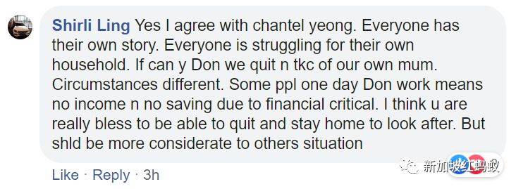 我同意Chantal Yeong所讲。家家有本难念的经。每个人都在挣扎著为各自家庭讨生活。如果可以的话,我们也想辞掉工作来照顾自己的母亲。但情况不同于往日。有些人一天不工作就没收入,而且经济拮据也没有存款可用。我认为你是有福气的人,能够辞掉工作留在家照顾老人。但希望你对他人的情况更富有同理心。