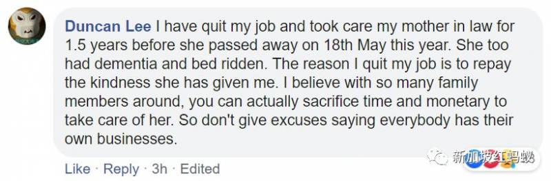 “我辞掉了工作来照顾我的岳母长达1年半,直到她在今年5月18日过世。她也患上失智症,行动不便只能卧病在床。我辞掉工作的原因是为了回报她的恩情。我相信有那么多家人在旁,你应该能够牺牲一些时间和金钱来照顾她。所以请不要再找借口说每个人都很忙有自己的事情要处理。”