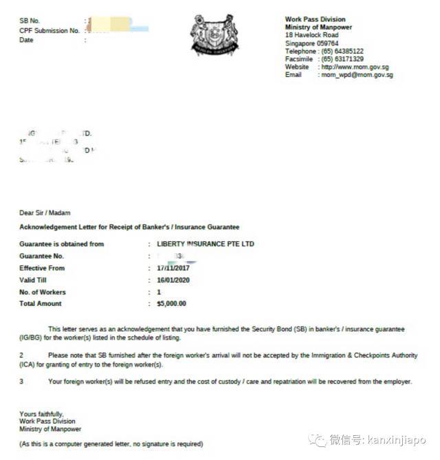 2、Security Bond,是新加坡人力部(MOM)指定要求WP购买的保险。