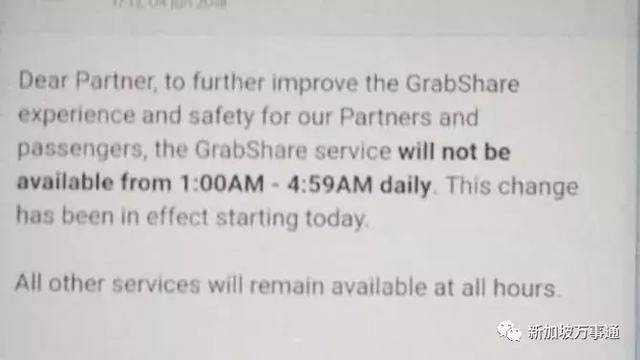 但是在本月初,Grab通过电子邮件向旗下司机宣布,要在凌晨1点到5点间废除这项服务。邮件中写道:“尊敬的合作伙伴:为了进一步改善你们及乘客的乘车体验及安全性,每日凌晨1点至凌晨4点59分之间,我们将停止提供GrabShare的服务。此改变由即日起生效,其他服务将继续全天候可使用。”