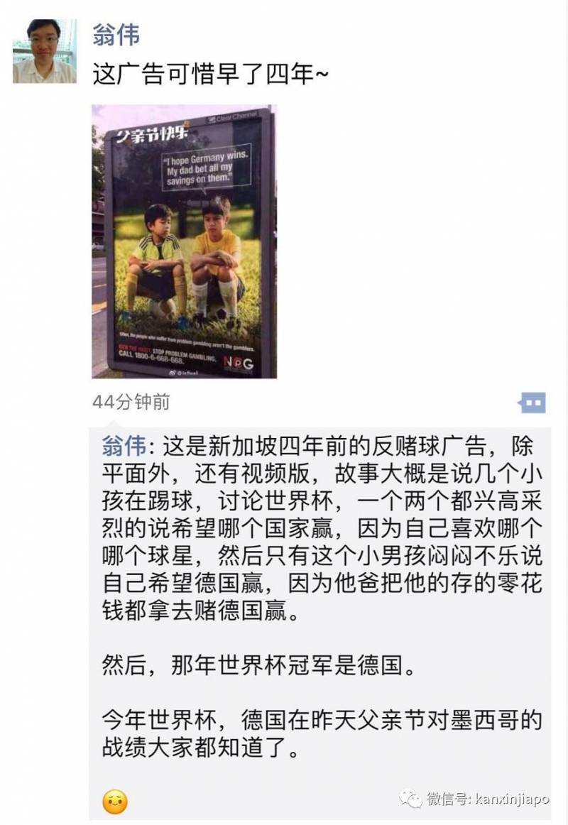 如今德国队输了,新加坡这个反赌球海报可以派上用场了。原版再发一次,新海报啥的,根本都不需要!