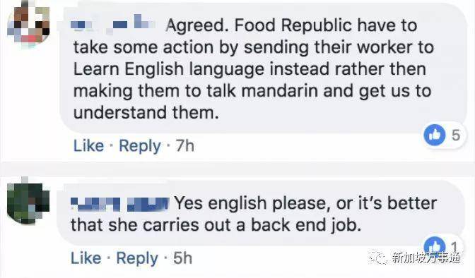 还有人同意这个安哥的说法“同意,FoodRepublic必须采取行动了,让他们的员工学习英文,不能让他们只说普通话,不能只能让我们理解他们。”还有人建议如果不会说英文可以去后台工作。