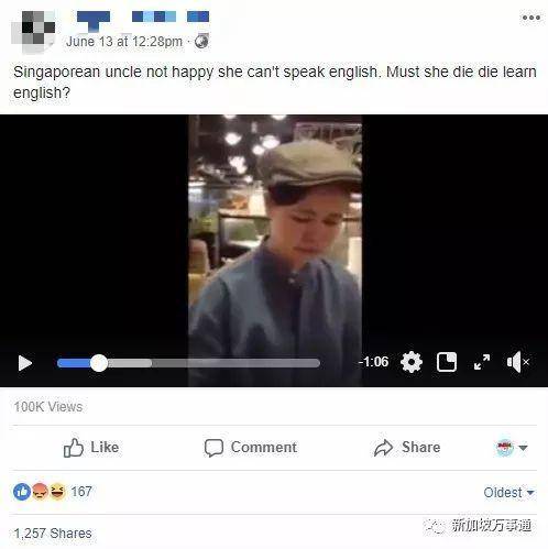 这则视频是最近被一名网友上传到Facebook上的,在视频中一名新加坡男子去食阁打包食物,但是为他服务的工作人员是个中国人,她并不会讲英文。