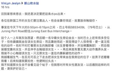 事发在6月19日下午大约5:50pm-6:15pm之间 ,巴士号码SBS3409L (79号巴士),从Jurong Port Road前往Jurong East Bus Interchange。