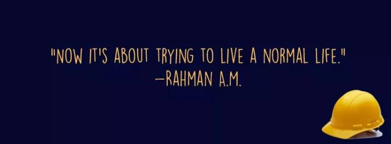 尽管遭遇了重创,但他最庆幸的是自己还活着。Rahman在医院接受治疗的时候,还鼓励其他烧伤患者积极面对人生。他还成为了人道主义移民经济组织(HOME)的一名志愿者,来帮助同样来自孟加拉国的工人们应对工伤及工资索赔问题。