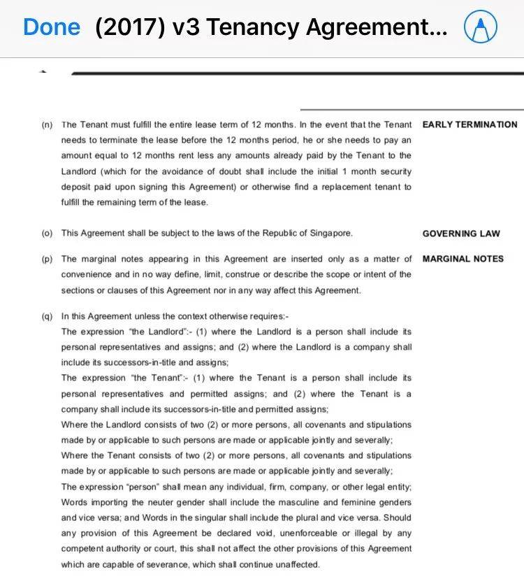 我租房子,当时签了两年合同。记得一条就是关于提前退租会不会赔钱,那条写着要是因为工作调动提前离开新加坡,就无需赔偿。