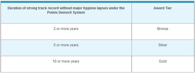 Scheme)将影响全岛超过3万6000个饮食场所,连续至少两年保持良好卫生记录、没犯过严重卫生缺失的饮食场所,将获得铜奖认证;有至少五年良好记录的可获银奖;维持至少10年的则可获金奖认证。