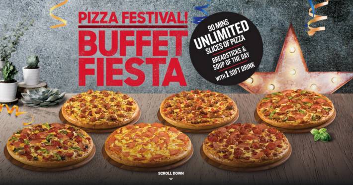 参与自助的Pizza口味有:Hawaiian, Chicken Supreme, Curry Chicken, Super Supreme, Meat Galore and Pepperoni pizzas