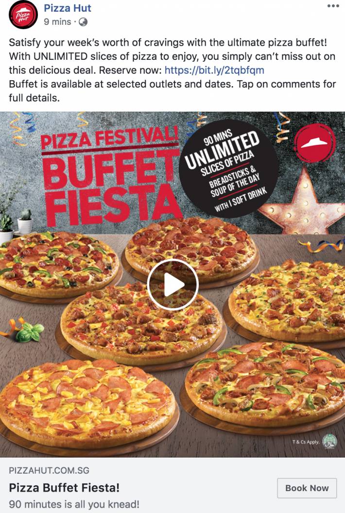 PizzaHut Facebook刚刚发文,2018年6月25日起至8月26日,PizzaHut 将推出Pizza 自助,Pizza,面包,汤,90分钟内随便吃,还送饮料一杯~