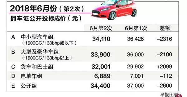 据最新的拥车证投标结果,应付大众市场需求的中小型汽车组(A组)、大型及豪华车组(B组)以及一般用于注册B组车款的公开组(E组)的成价都下跌5%至7%。创下过去七八年来的新低。