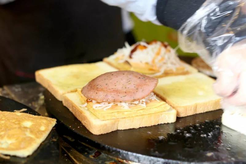 这里的每一份三明治都是点了才现场制作,上下的两片面包会煎到适当的酥脆度。你可以挑上自己喜欢的内陷,里面有肉类、蛋饼、芝士、酱汁等等,有的还会加上蔬菜丝。