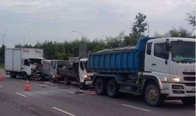 而此时,另外两辆货车不知何故,相继从后方追撞上来。
