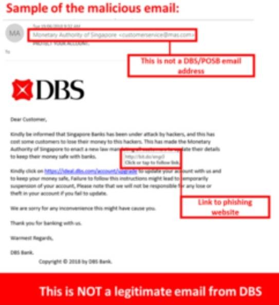 据星展银行提供的电邮截图显示,发出电邮的地址并不是星展银行或储蓄银行的电邮地址,而是冒充来自新加坡金融管理局(MAS)的地址。
