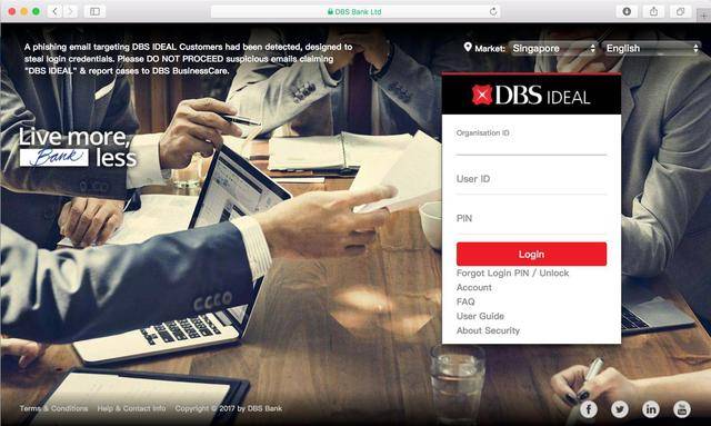 DBS指出,该钓鱼网站(phishing page)目前主要针对的是星展企业网银(DBS IDEAL)用户。