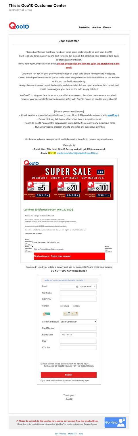 同样的手段,不法分子向Qoo10的客户发送诈骗邮件,索取个人信息和信用卡资料。