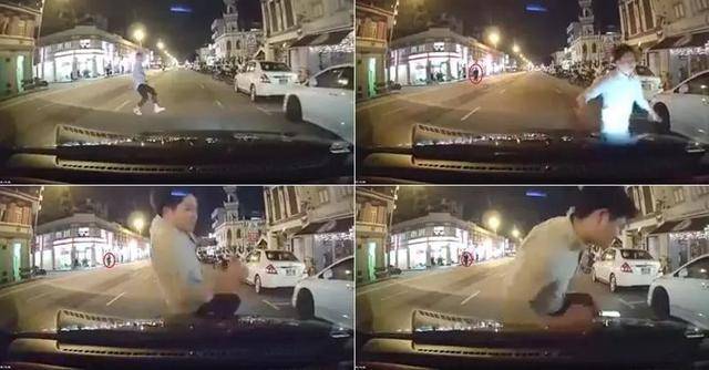 不料,青年跑到萨尔瓦的车前时,却纵身一跃,猛力撞上车子引擎盖,吓得他鸣笛,车上乘客当时吓坏大叫。青年肉身“撞”车后,离开引擎盖,用手怒拍车子,继续朝着车龙跑,扑向别的车上。