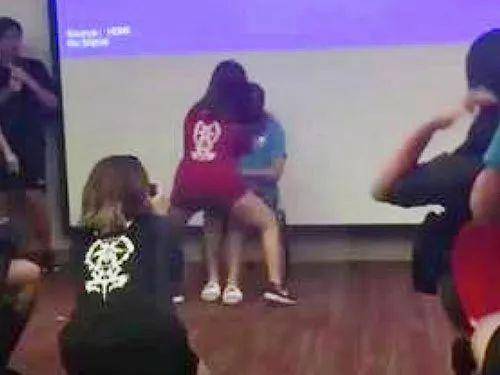 视频中,一名男学生坐在讲台中间的椅子,身旁一名穿红色上衣,黑色小短裤的长发女学生尽情地跳着热舞。女学生甚至故意将身体凑到男生身边,大幅度地扭动身子,还不时将手放在男学生的大腿上。