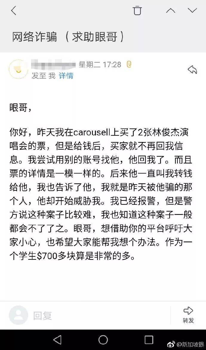 最近买林俊杰新加坡演唱会门票的网友很多,然而遇到的问题也多,有的人在售票网站购买遇到“已售完”通知,有的凌晨5点到线下排队几个小时,有的被逼无奈找了黄牛……下面这位在carousell上购买的,付了$730,结果卖家“消失”了……
