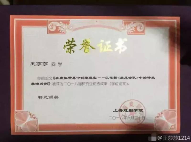 此外,她还晒出了自己的一些荣誉证书,其中有一篇论文被评为2018届研究生优秀成功,这篇论文就是《在虚拟世界中创造现实——以电影中的特效表演为例》,很多网友看到后,都纷纷赞叹,称她为学霸。