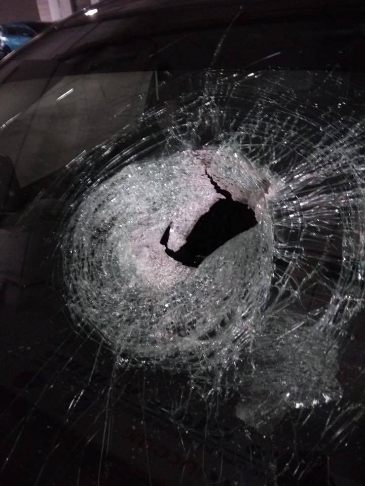 当时他的车子被一块包着报纸的大石块砸中,挡风玻璃同样的位置被砸穿!