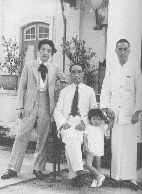 (1939年,徐悲鸿(左)寓居江夏堂,中间坐着的黄曼士为江夏堂的主人。)