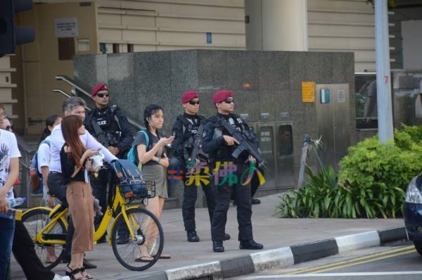 新加坡警察原地反应小组,执行步巡任务的情况。(网络图片) Posted in:中国报 China Press