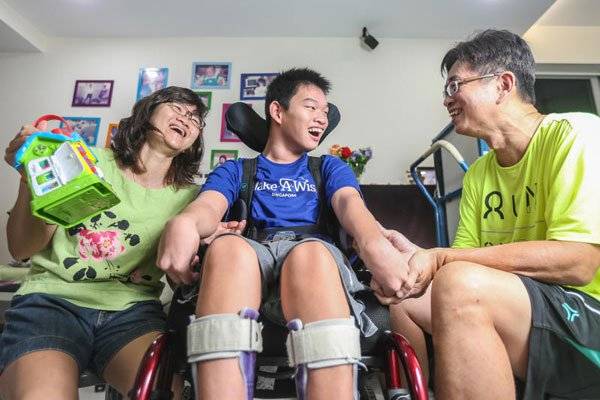 (新加坡25日讯)不能走、不能说、不能自理,患有脑性麻痹的16岁的男生,有疼爱他的父母愿意当他的双手双脚,要带他环游世界。