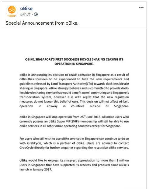 oBike(6月25日)宣布,要退出新加坡市场了!!!