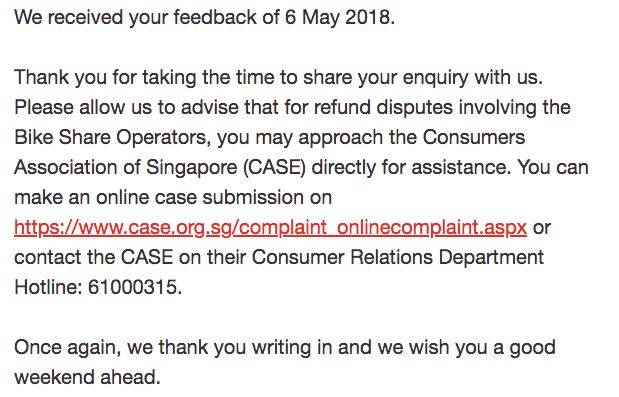 这位网友还分享了自己就oBike退押金这件事向陆路交通管理局(LTA)咨询,而得到的回复是: