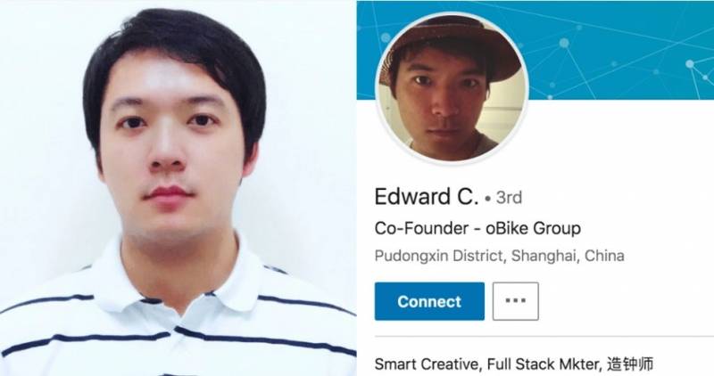 这位嫩嫩白白的小鲜肉,名叫Edward Chen,据说就是oBike的创始人之一,而且还是oBike的首席营销官,主要负责的就是品牌建设。
